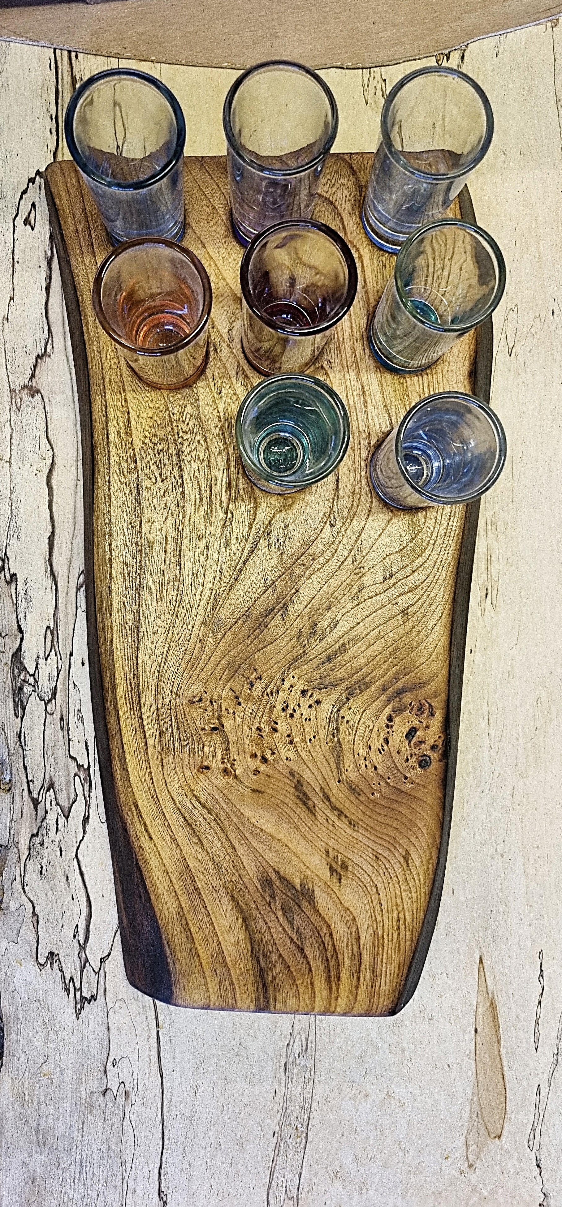 Acacia wooden drinks display board with vintage coloured bubble base glasses